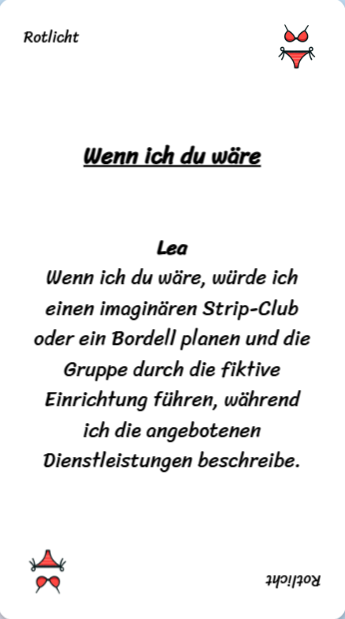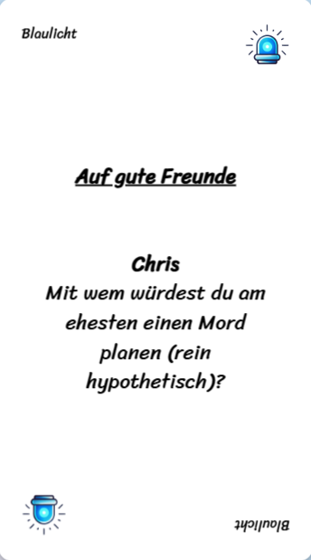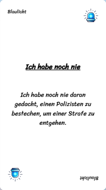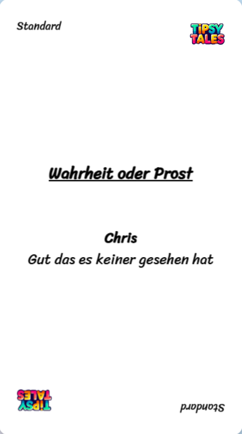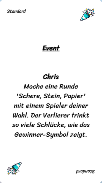 Der genannte Spieler wählt immer eine Person aus, auf die der Karteninhalt seiner Meinung nach am besten zutrifft. Dieser muss trinken!
