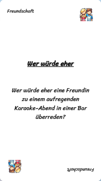 Von schrägen Herausforderungen bis zu lustigen Fragen, die euch zum Lachen bringen – hier kommt garantiert keine Langeweile auf. Macht euch bereit für unvergessliche Abende, bei denen die Geschichten am nächsten Tag noch wilder werden!